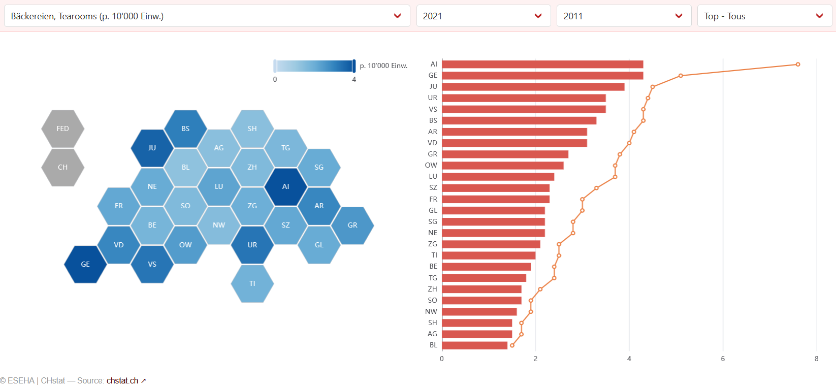 Im Jahr 2021 gab es in der Schweiz 1997 Bäckereien und Tearooms, also 2,3 pro 10'000 Einwohner, gegenüber 2,8 zehn Jahre zuvor (2227). Zwischen 2011 und 2021 sind somit 230 Bäckereien in der Schweiz verschwunden (-12 %). Derzeit ist Genf der Kanton mit der höchsten Dichte an Bäckereien und Teerooms, gefolgt vom Jura, Uri und dem Wallis. Basel-Landschaft bildet mit der geringsten Dichte (1,4) das Schlusslicht. Die französischsprachigen Kantone sind am stärksten an Bäckereien gebunden (Durchschnitt von 3,2 pro 10'000 Einwohner), vor den deutschsprachigen Kantonen (2,3) und dem Tessin (2). Die Dichte an Bäckereien und Teerooms ist in Städtische Gemeinde einer grossen Agglomeration (2,6) und in den Ländliche periphere Gemeinden (3,6) höher. Die Dichte ist in den mehrheitlich katholischen Kantonen (2,8) höher als in den mehrheitlich protestantischen Kantonen (2,2). Der Kanton Zürich scheint am wenigsten versorgt zu sein (1,7 pro 10'000 Einwohner), was eine Art «Weggligraben» bestätigt.
